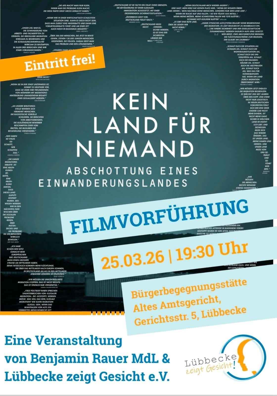 Gerne leiten wir Euch diese Einladung zur Filmvorführung von "Kein Land für Niemand" weiter, veranstaltet von Benjamin Rauer und Lübbecke Zeigt Gesicht. Sie findet am Mittwoch, dem 25.März im Alten Amtsgericht statt und der Eintritt ist frei!