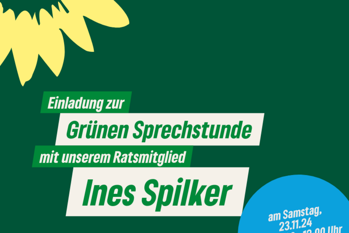 Die nächste grüne Sprechstunde findet statt am 23. November von 10 - 12 Uhr mit unserem Ratsmitglied Ines Spilker